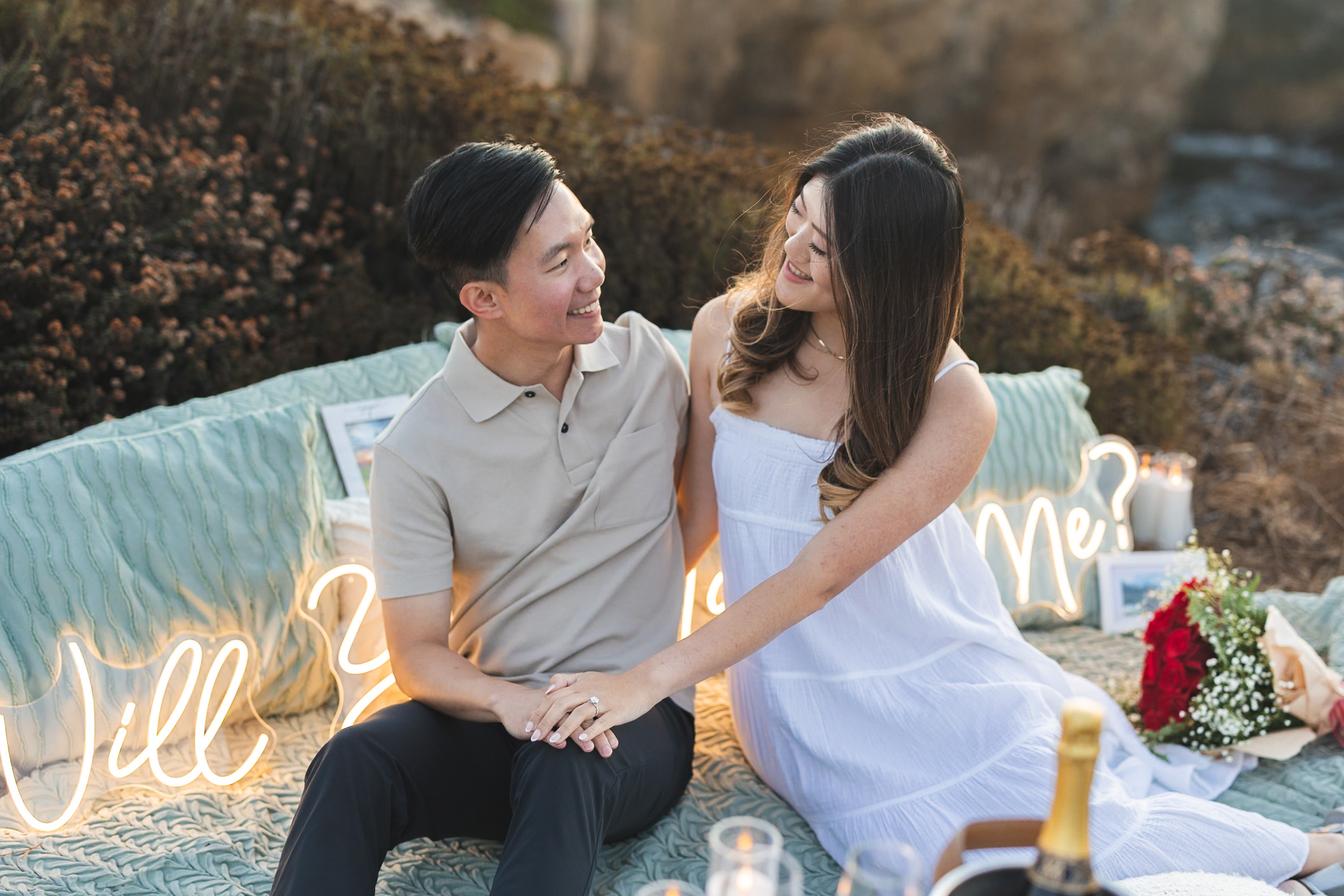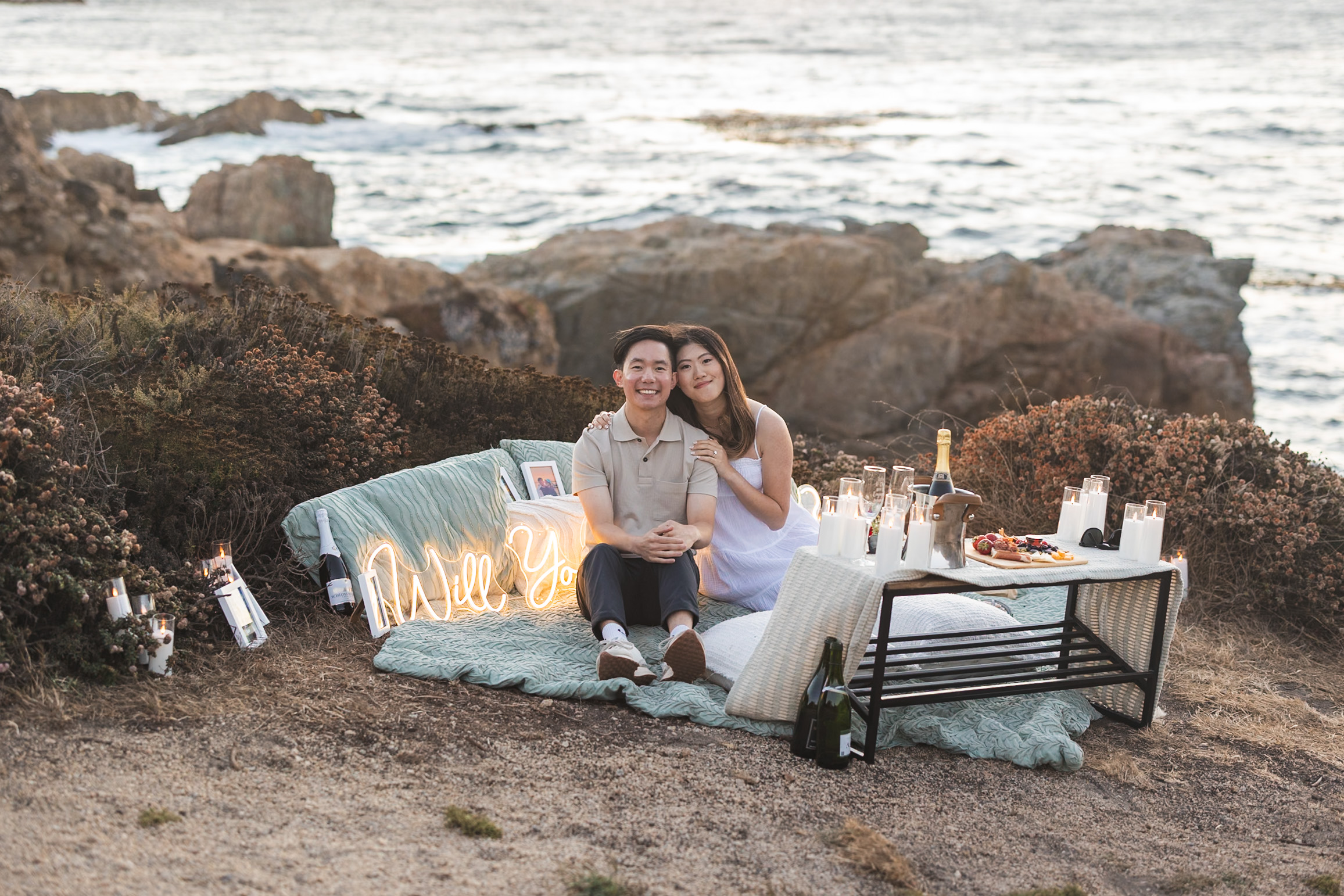 Cozy, charming proposal with a curated picnic setup—blanket, pillows, charcuterie, chilled champagne—plus a 30-minute portrait session.