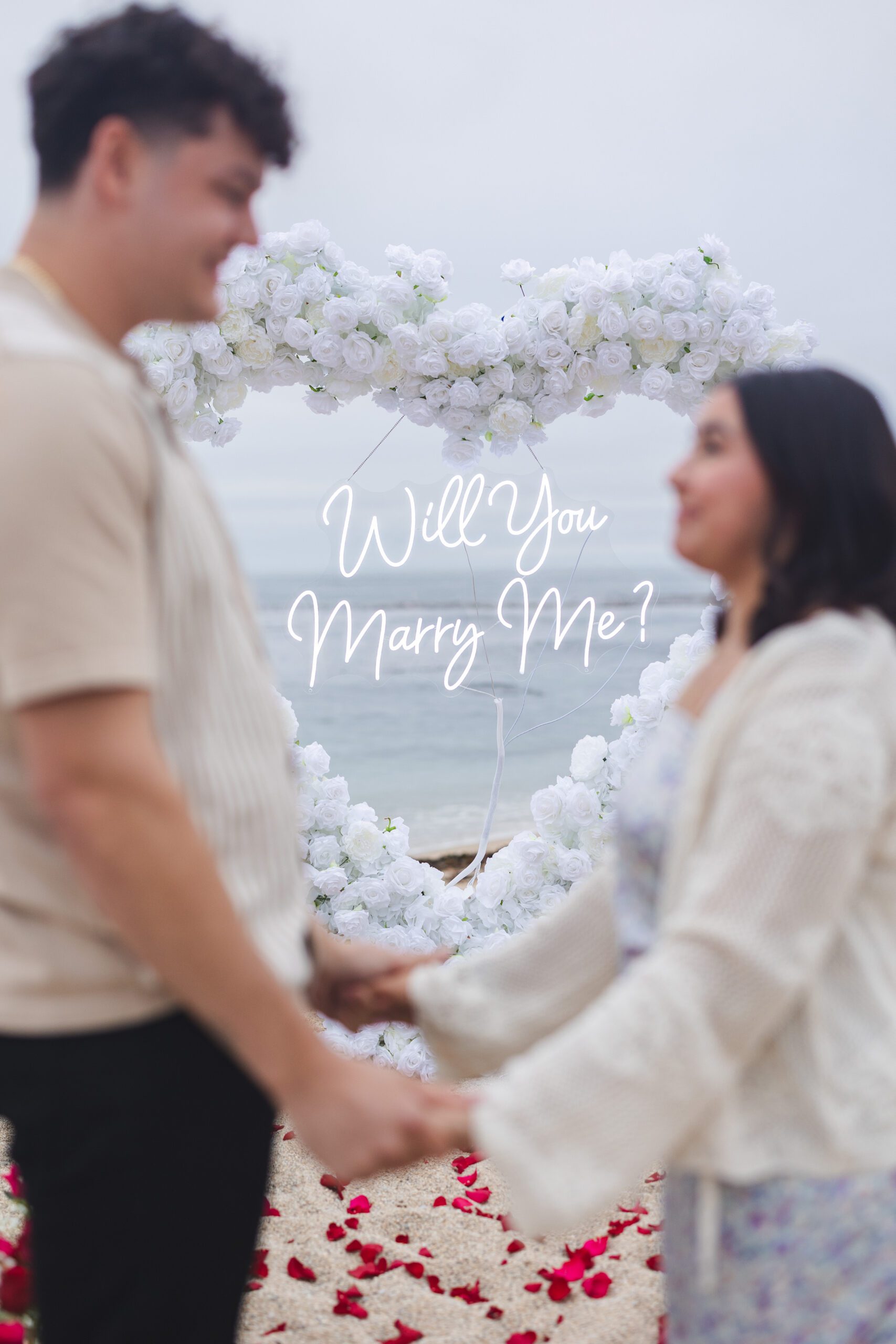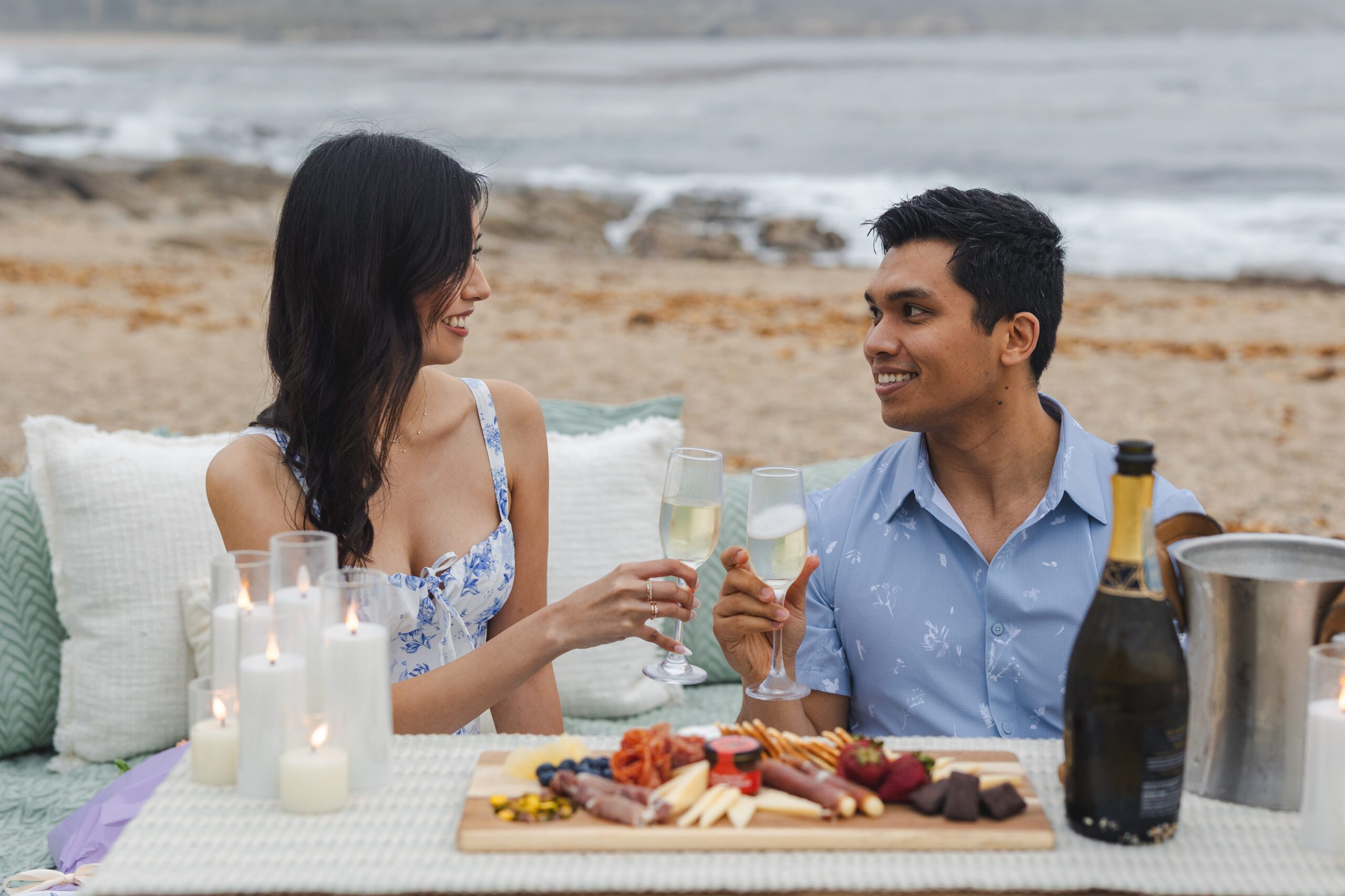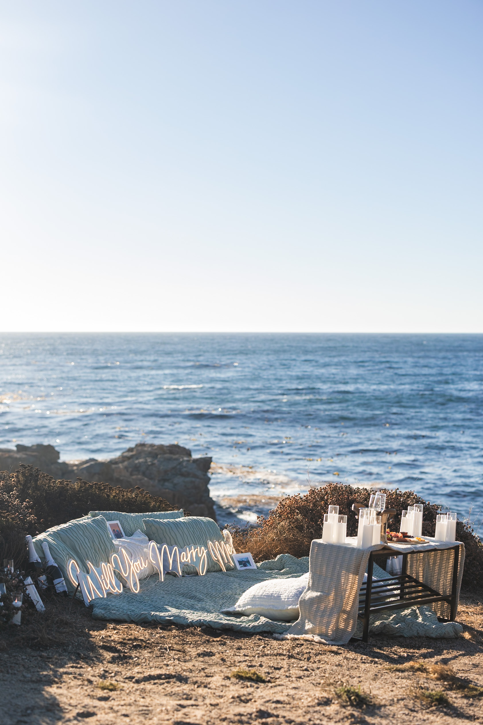 Includes: Picnic Table, Blanket, Pillows, Rose Bouquet, Charcuterie Tray, Chilled Champagne, Bluetooth Speaker & "Will You Marry Me" LED Sign.