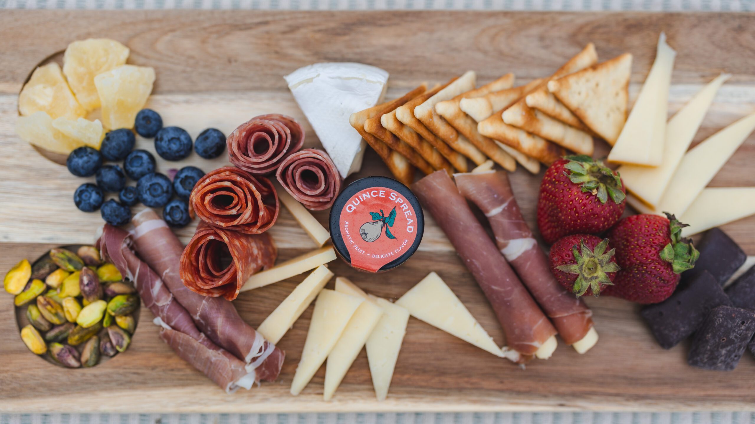 | Picnic Setup: Picnic Table, Charcuterie, Chilled Champagne, Flowers, Blanket, Pillows
